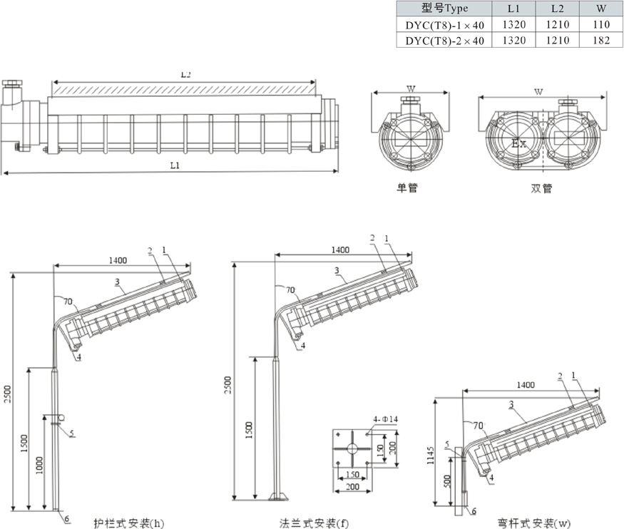按產品型號說明逐條選擇,例:需要T8節能燈管2X40W,護欄式安裝,則產品型號為DYC(T8)-2×40h;