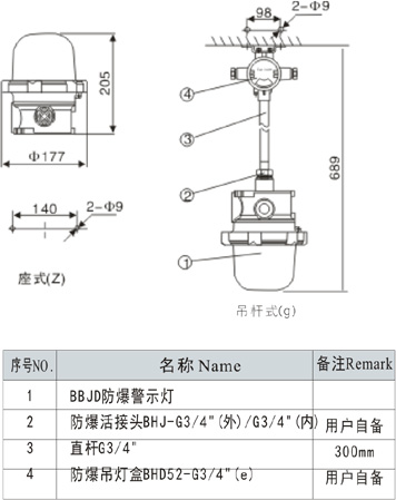 ◆吊桿式出廠時,只配直桿G3/4"(300mm),若需防爆接線盒,防爆活接頭等配件,請另外注明。