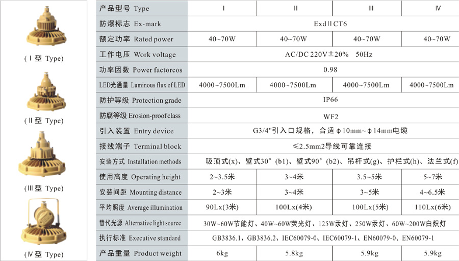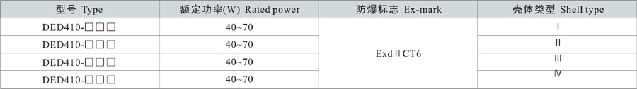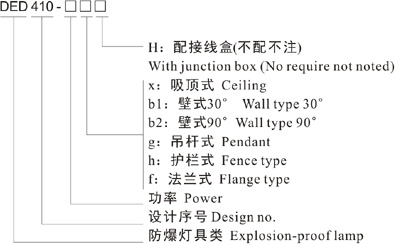 Note: 1. Select according to the product model description, pay attention to marking out the ex-mark;e.g.: Need product of 40W, 220V, pendant type, with junction box,gas explosion-proof, then the model should beDED410-40gH ExdIICT6 Gb;